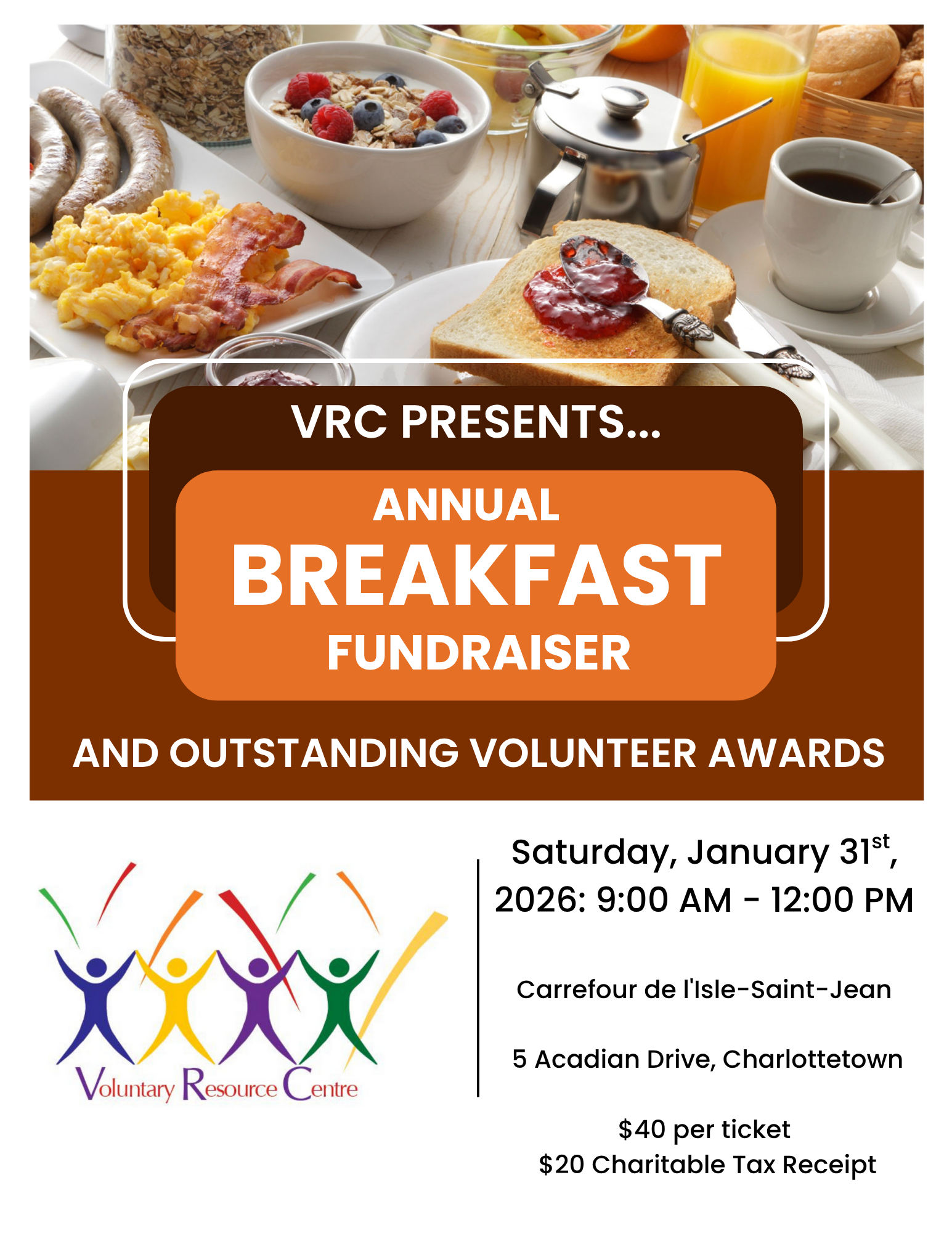 For $40, you can feast on eggs, bacon, sausages, pancakes, and more all while supporting the VRC and our mission to empower and celebrate volunteers across PEI.
